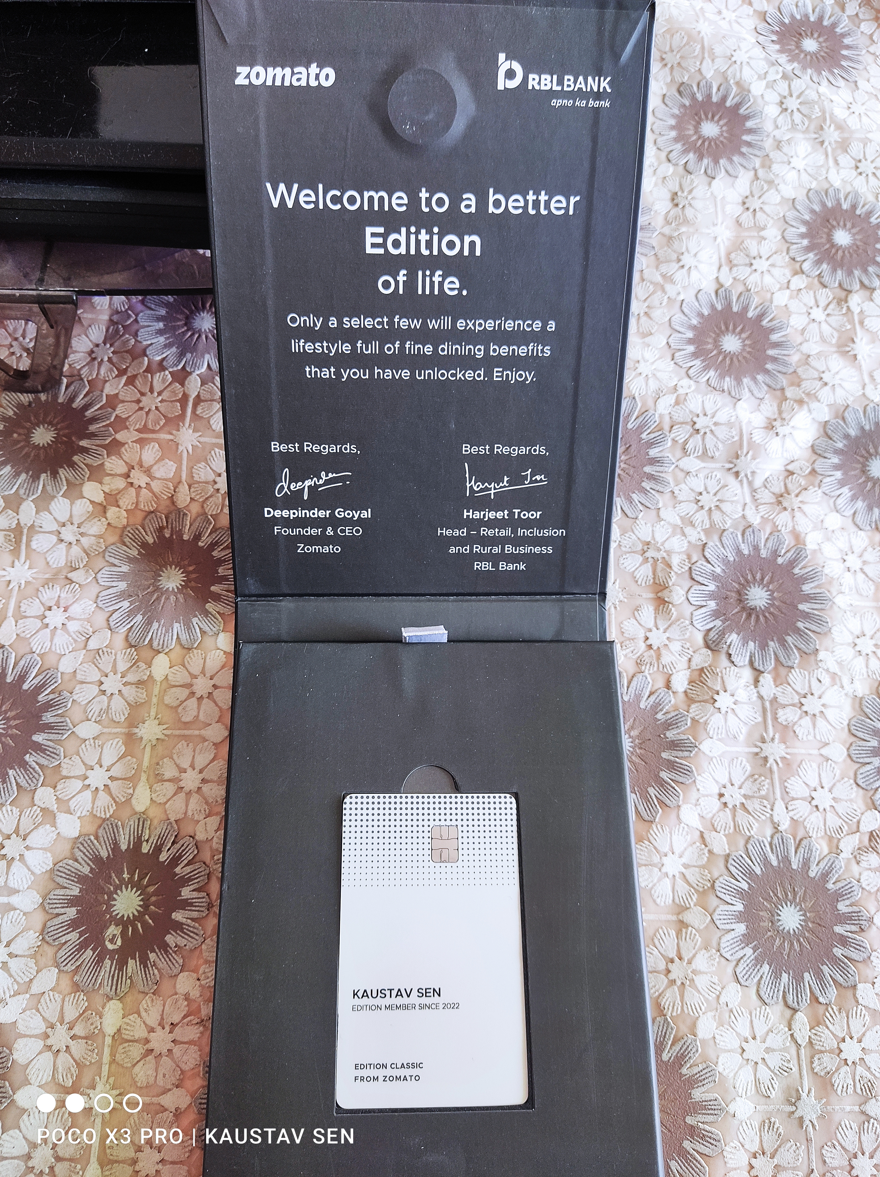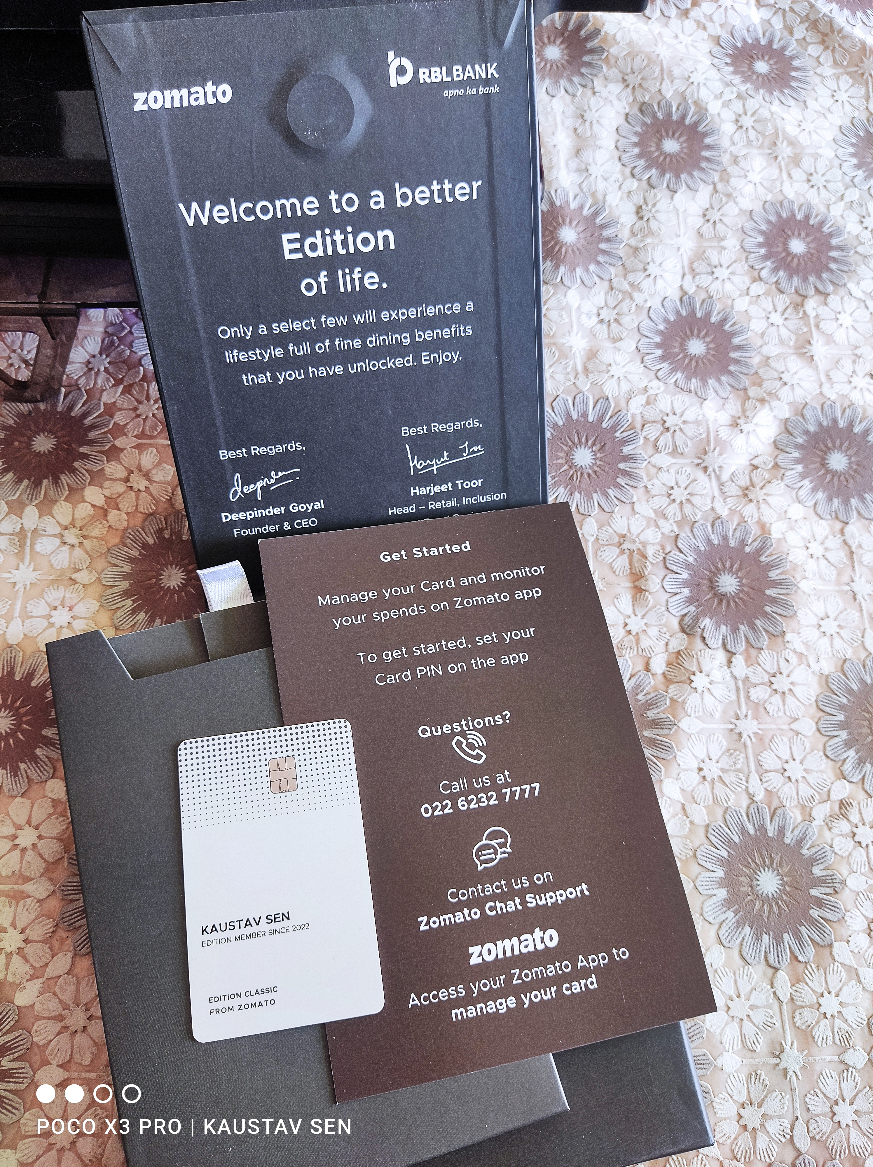 The application process is simple. You log in to the Zomato app, head over to the tab that says, Money. There, you’ll find the option for a Zomato wallet and Editon. Selecting Edition will take you to a signing up page, where you provide consent of application, addresses, etc and then upload the documents. The KYC with RBL bank happens over video call and is smooth. And then, in about 2/3 business days, you have the card with you.