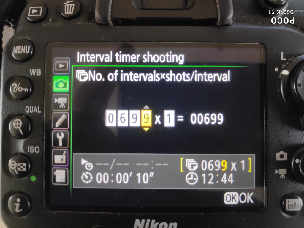 The photo above shows a setting where 699 photos shall be taken, with a 10 second interval between them. So, total exposure time is 6990 seconds. The setting can be done as shown in the below photos.
